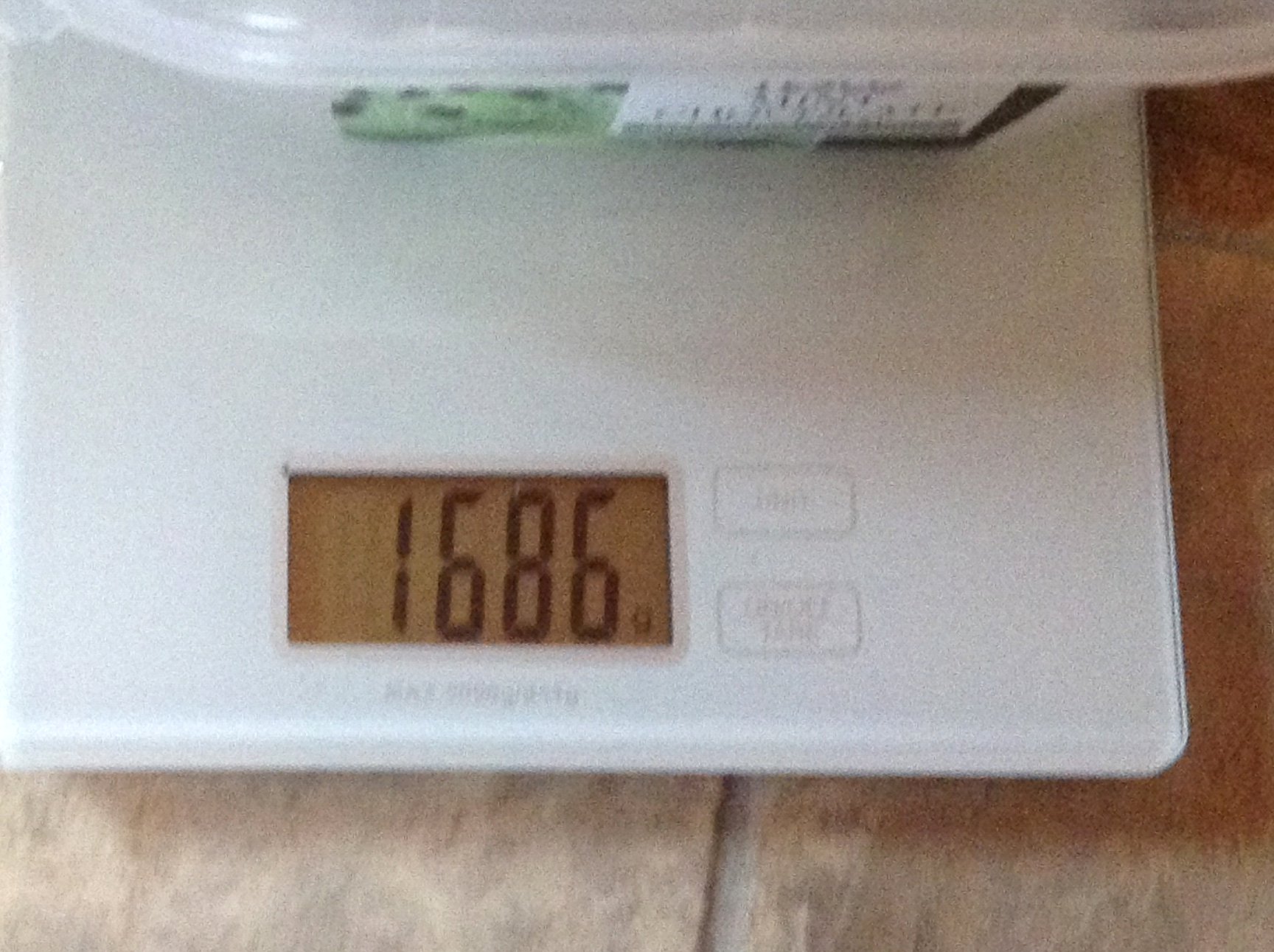 I had to put him on an ice cream tub as he was touching the ground without it. So the final weight is 1686g or 3.712 lbs!