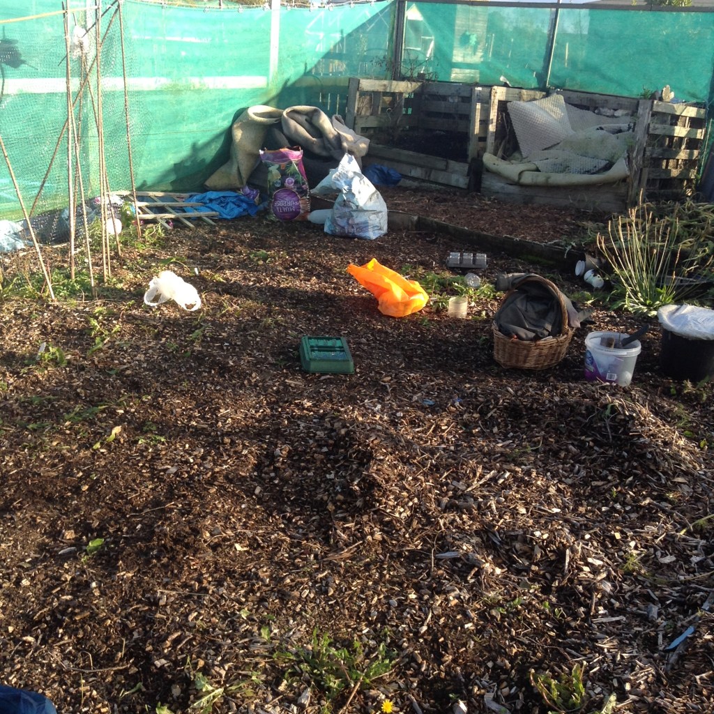 The last job for this patch will be to pull the blue cover over, which you can see to the right with the bags and tyre on it! We’ll use it to protect the bay and keep weed growth down.