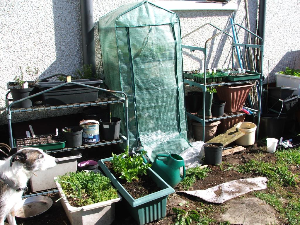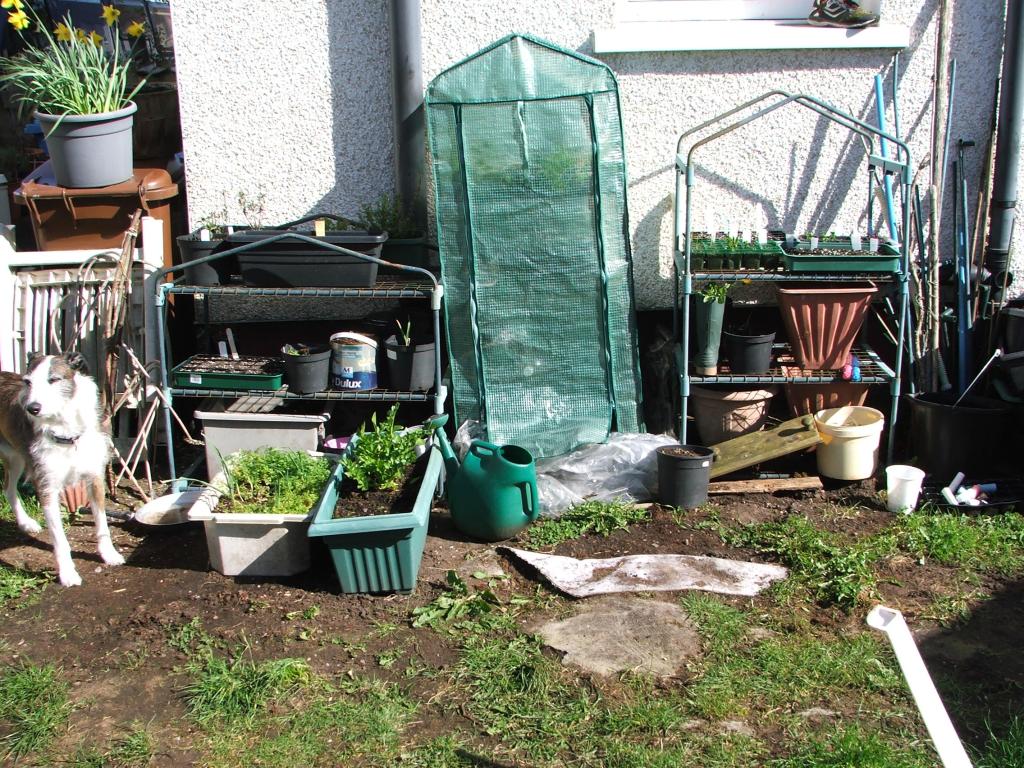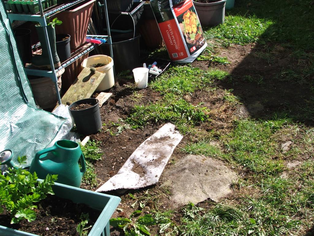 The selection of crappy mini greenhouses will be going inside whatever I manage to put together. Scooby agreed with me that the area can be levelled a little and we can come up with something useful! I’m going to use the yellow covering which is currently on the allotment, dig a little trench all the way round and bury the cover ends so it will be weather ready!