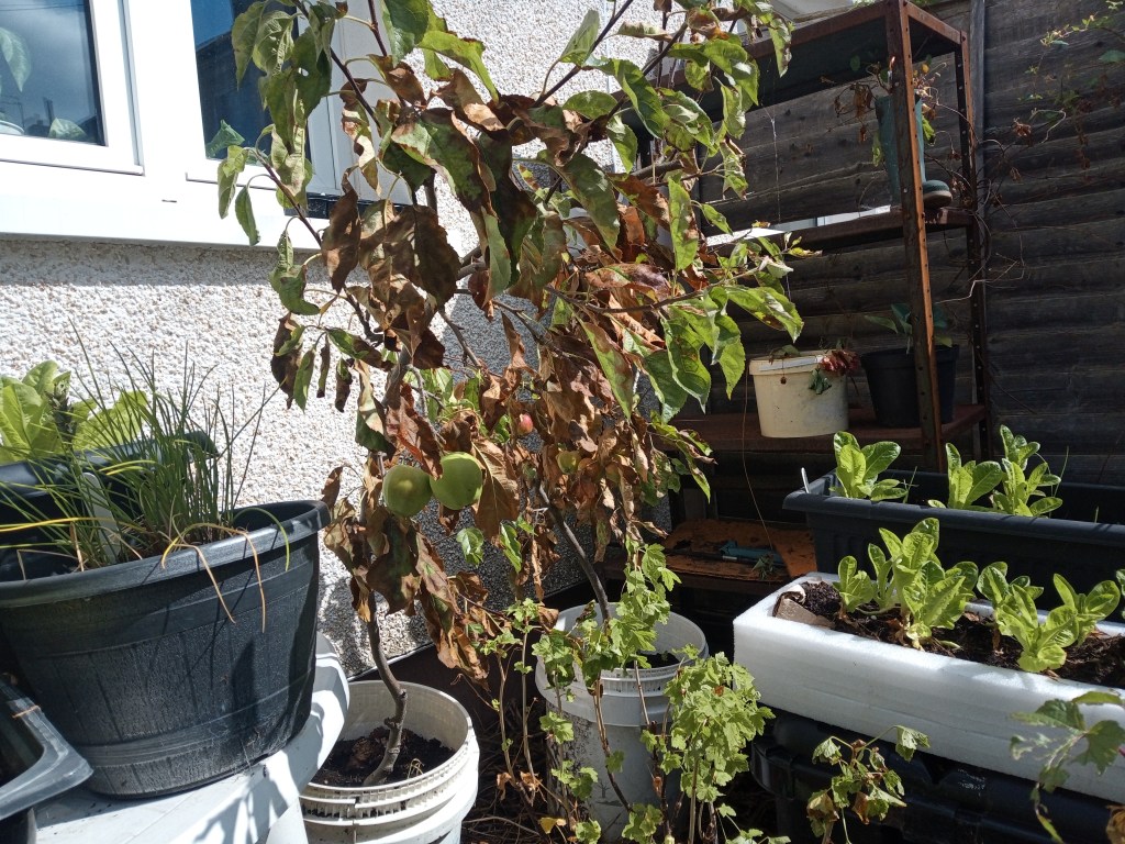I’m pretty much the only person in the house who uses the back garden but I’m just not happy with the layout, I don’t feel comfortable with it. The apple trees are in large tubs and they don’t look happy either. I’m trying to decide if one should go in the front garden which is colder and one up to the allotment?