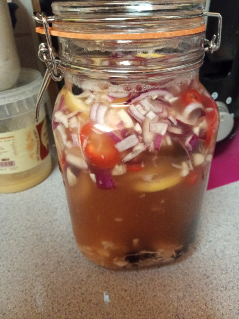 I’ll put a link to her fire cider page but to let you know, I added: onion, garlic, ginger, horseradish, chilli peppers, raw apple cider vinegar, blackcurrants, blackberries and a lemon. I could probably do with adding a bit more ginger and some herbs like rosemary – might do that today.