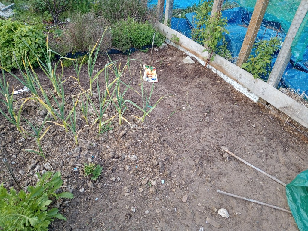 The next photos show some progress – the weedy corner has been cleared and the area by the fence now has shallots and onions in it;