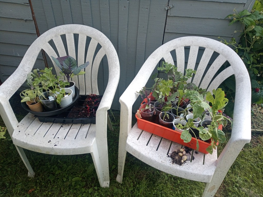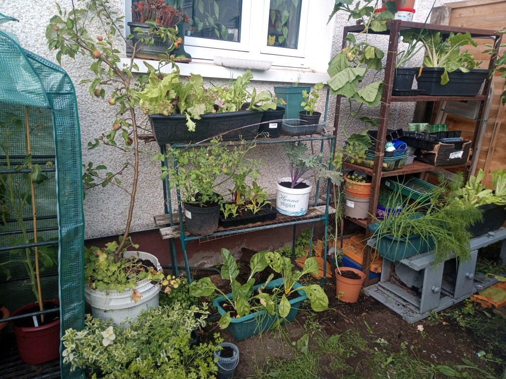 Seed HQ which became seedling HQ is now Salad HQ! I have a range which covers tomatoes, lettuce, spring onions, chard, kale, herbs and a few other bits and pieces. The salads are getting moved around as some are coming to the end of their use. I picked the outer leaves from most for a while, but now I’m letting them grow their best so I can get a small head of lettuce. If you pretend you’re a nosey neighbour and peer in the window, you’ll see where I grow most of my chillies!