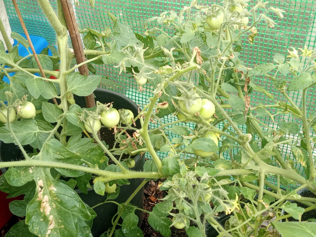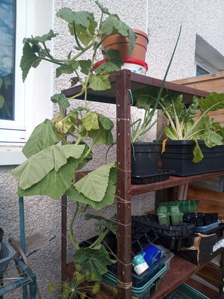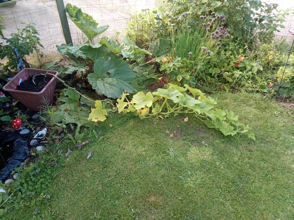 The last pictures show the Atlantic Giant pumpkin I’m growing in a large pot. Not sure if it will work but there is one little pumpkin showing on the end so fingers crossed!